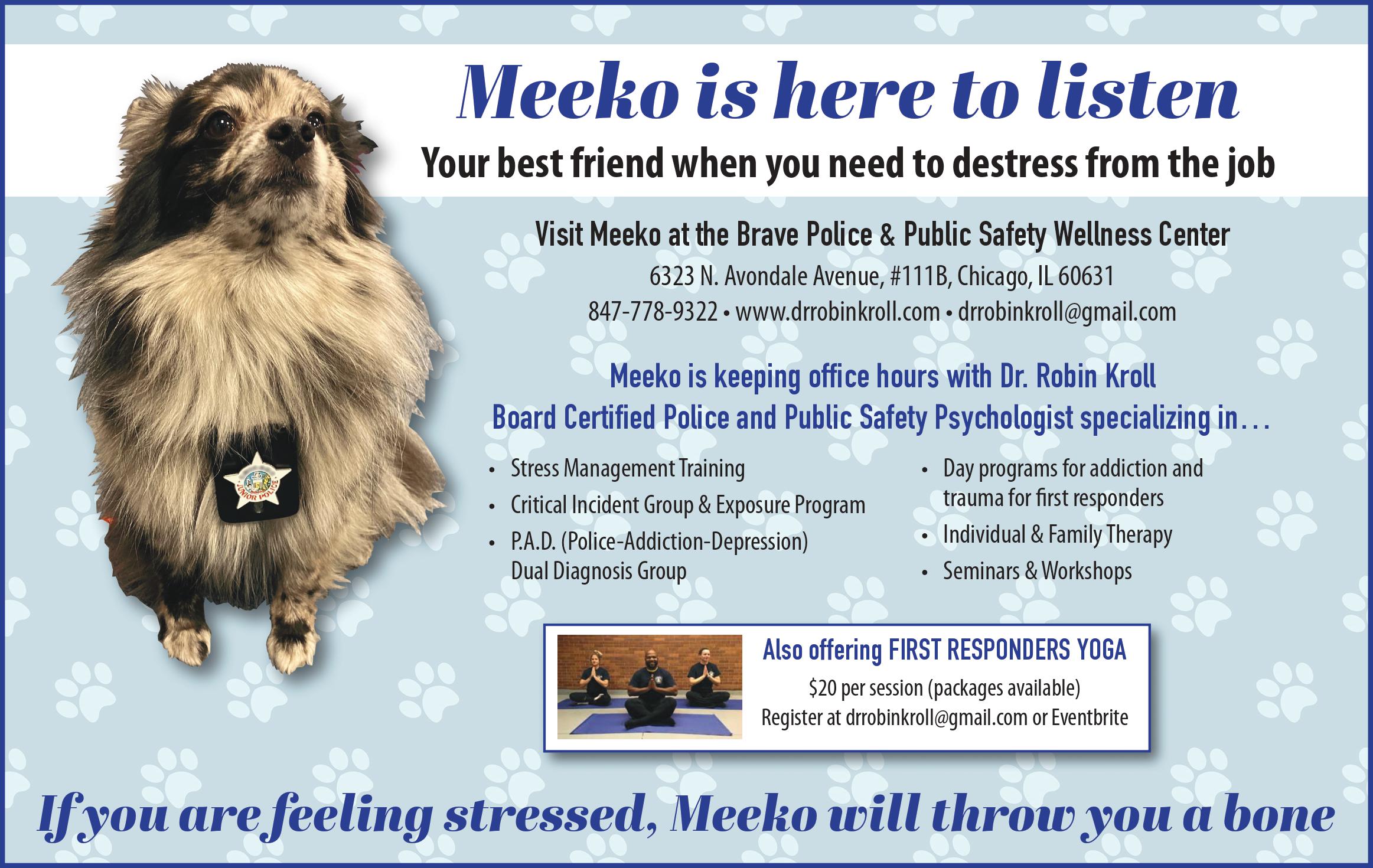 Hi, my name is Meeko and I am a therapy dog. I go to work with my mom and help police and other first responders feel better. As police, you are trained to react to situations and handle crises – this demonstrates good policing. But what happens during those down times? Does your body stay heightened as you wait for the next call? This is often the case. This is not good for your mind or body. Take time to paws. When I have down time, I let my body rest. I do this by taking deep breaths and allowing my muscles to relax. It only takes seconds. I take a moment to close my eyes and imagine something peaceful. I call it my calm place.